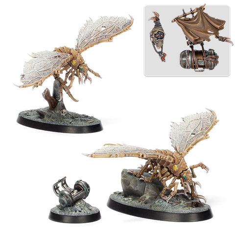 The Ash Waste Nomads live an austere life out on the dusty plains of Necromunda, scavenging and living off the land. Their affinity for the wilds has led them to domesticate a range of macro-insects, including the winged Ashwing Helamites. This set contains two plastic Ashwing Helamites, which can be built on scenic bases or on flying stands, an Ashwing Lure, and an alternative head and backpack to mark out a regular Nomad as their handler.