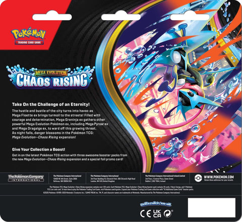 The hustle and bustle of the city turns into havoc as Mega Floette ex brings turmoil to the streets! Filled with courage and determination, Mega Greninja ex gathers other powerful Mega Evolution Pokémon ex, including Mega Pyroar ex and Mega Dragalge ex, to ward off this growing threat. As night falls, danger blossoms in the Pokémon TCG: Mega Evolution—Chaos Rising expansion!